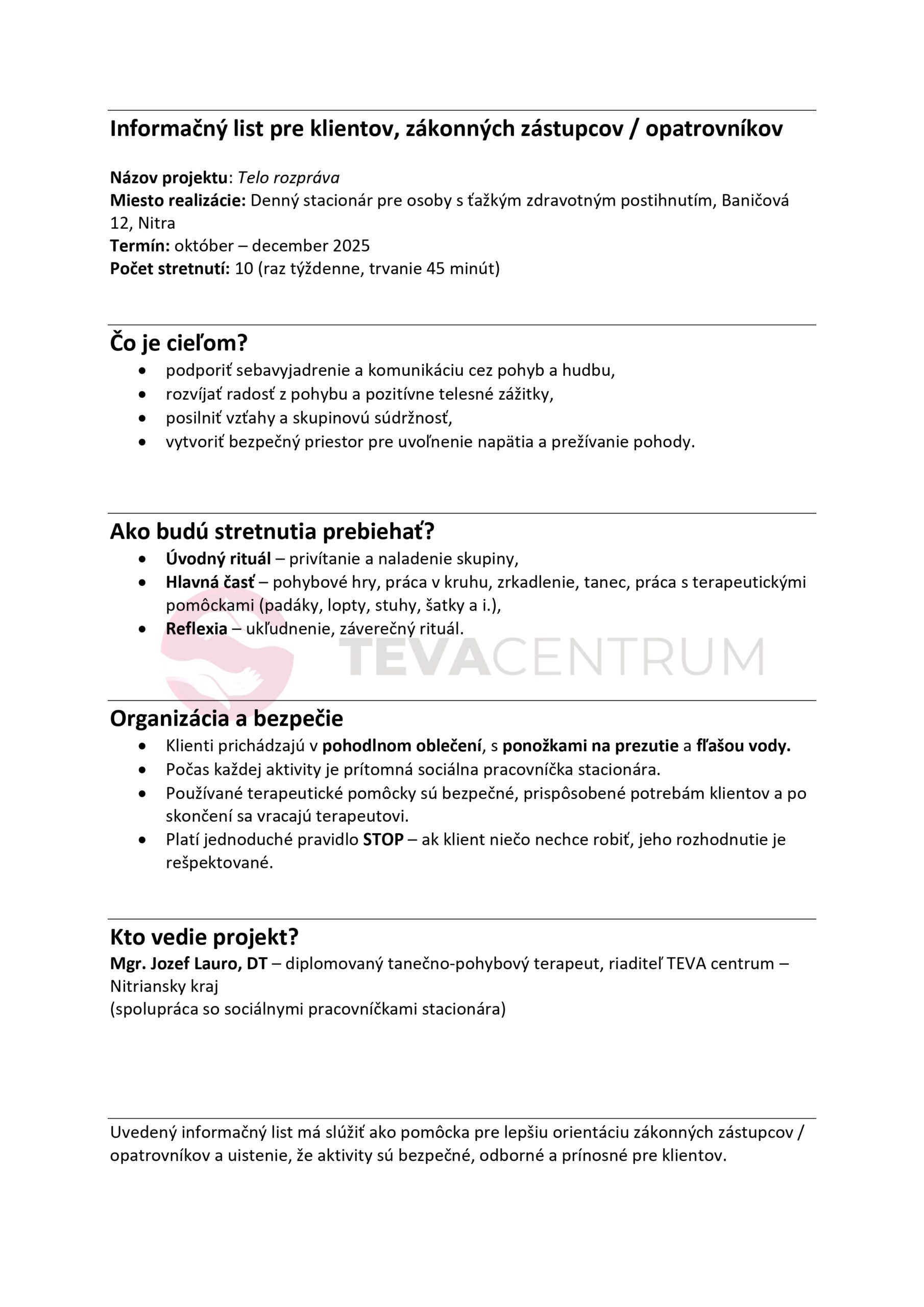 Realizácia terapeutických stretnutí bola realizovaná vďaka podpore Nitrianského samosprávneho kraja pod vedením predsedu župana Branislava Becíka zameraná na podporu sociálne a zdravotne znevýhodnených občanov.