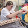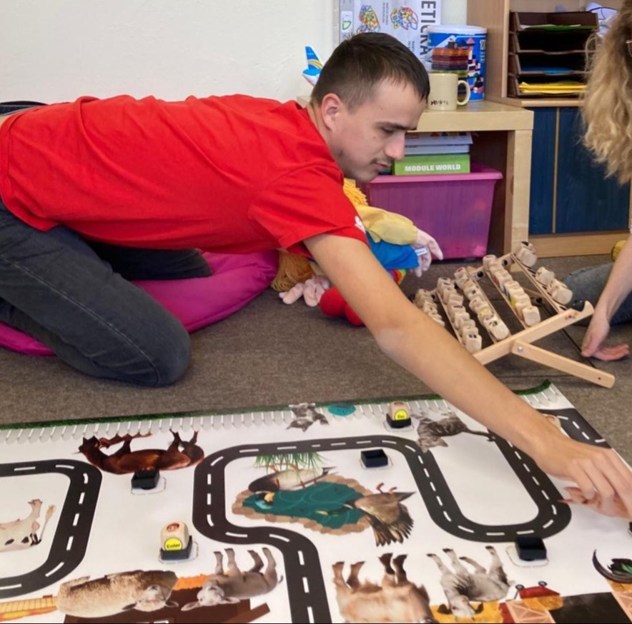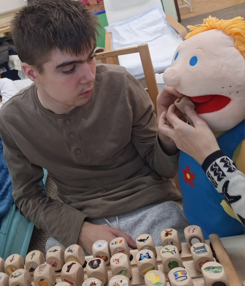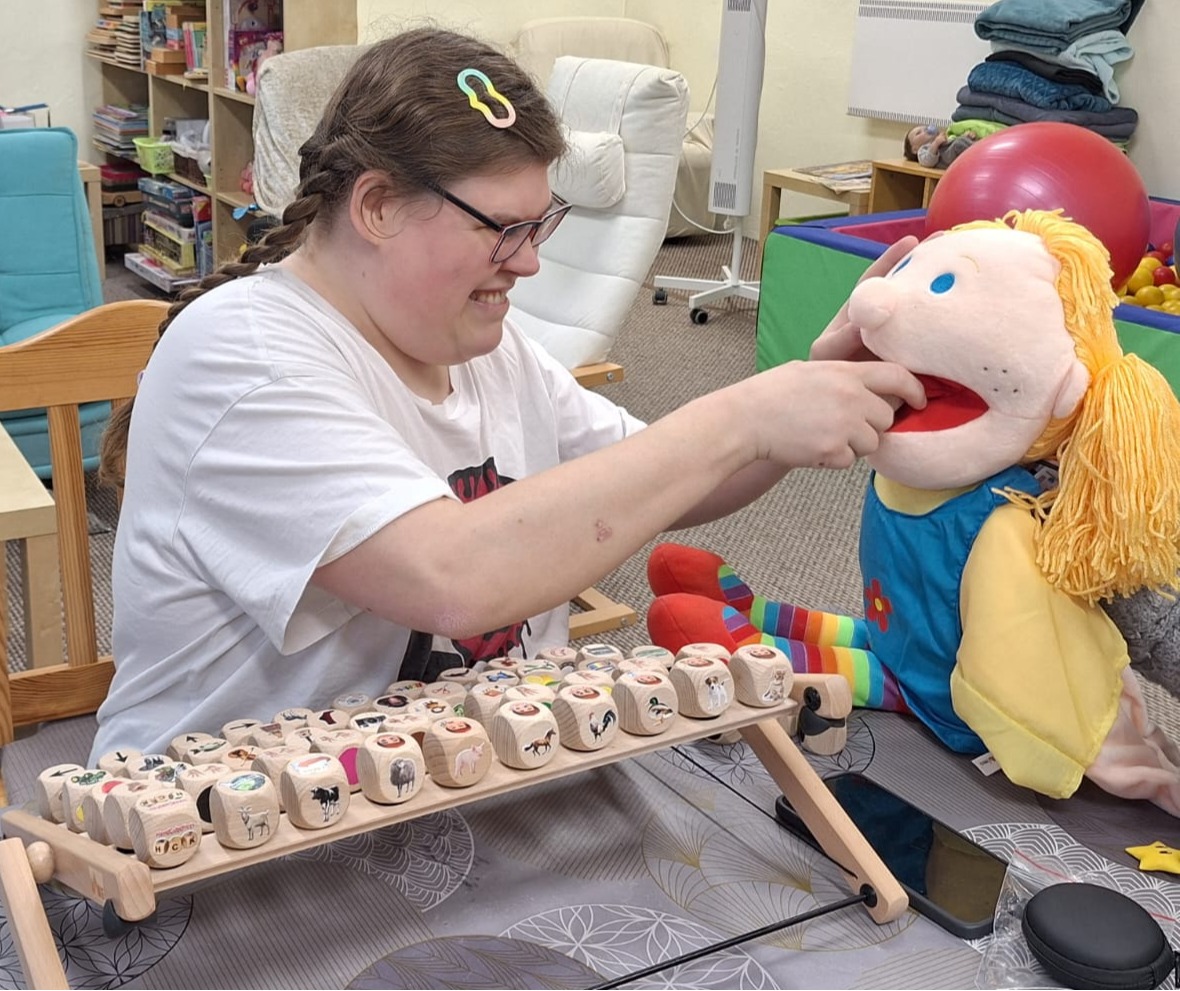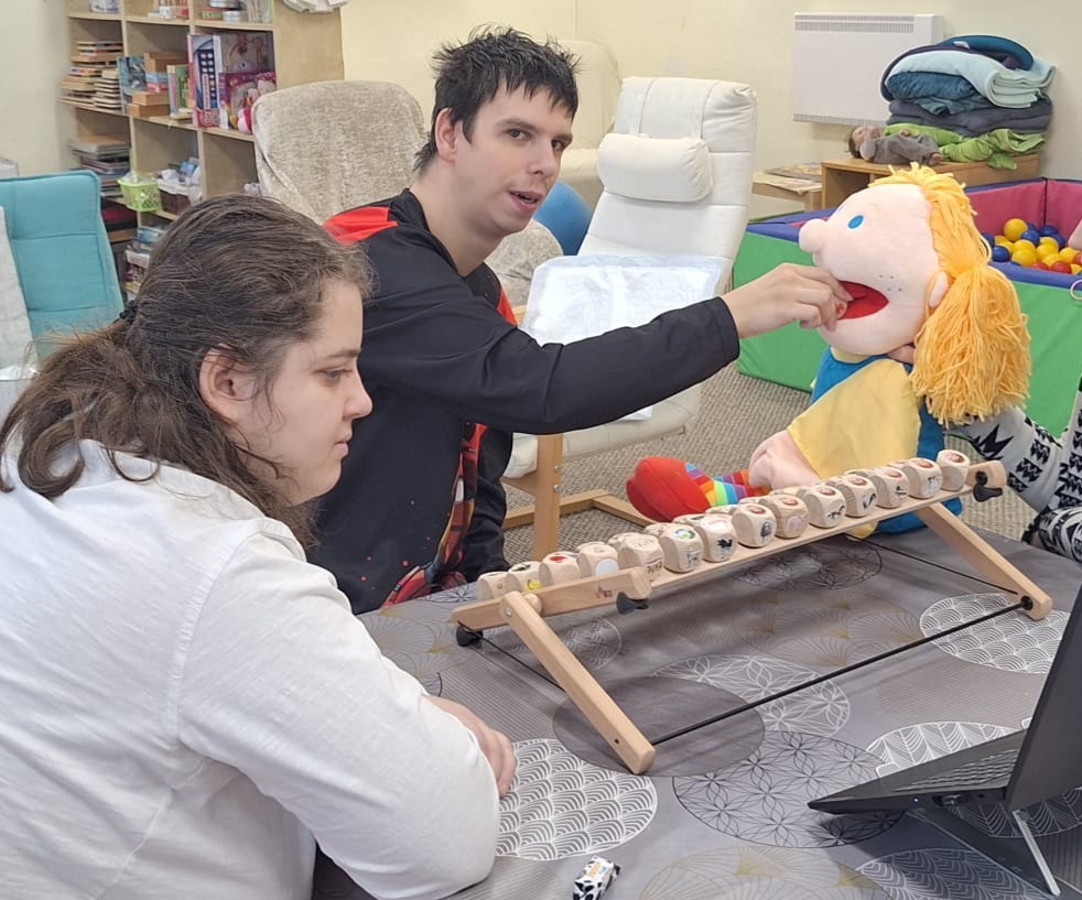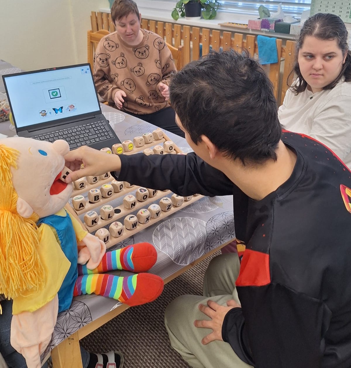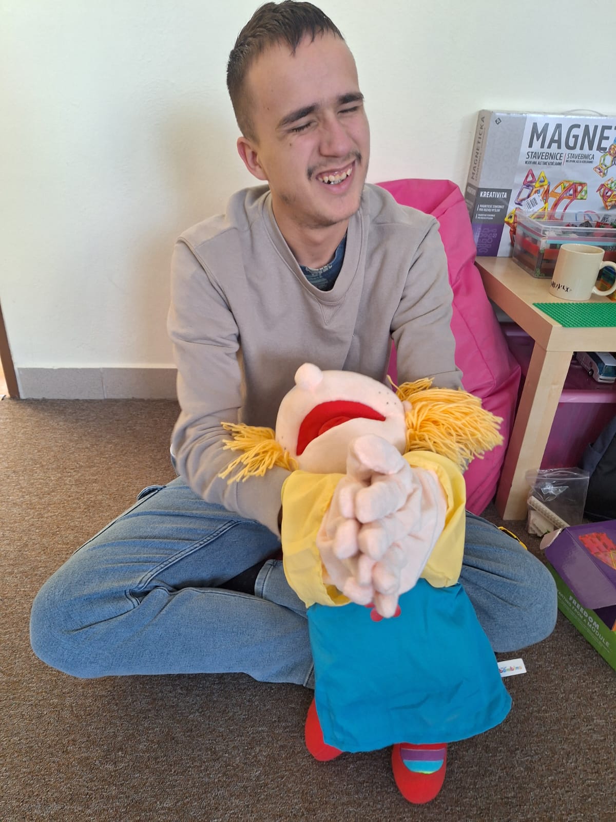 V dennom stacionári pre osoby s poruchami autistického spektra neustále hľadáme nové spôsoby, ako podporiť prijímateľov sociálnej služby, ktorí majú problém vyjadriť svoje potreby a myšlienky. Aj keď sú dospelí, vnútri často zostáva ich detská hravosť a zvedavosť, a tomu prispôsobujeme každodenné aktivity. Preto je pre nás veľkým prínosom ďalšia didaktická pomôcka – drevená klávesnica HandCubeKeys. Drevená klávesnica s maňuškou a interaktívnymi podložkami otvára našim prijímateľom sociálnej služby nové metódy rozvoja komunikačných zručností, kognitívnych funkcií a zmyslového vnímania. Klávesnicu tvorí 50 veľkých drevených kociek. Na každej kocke je dobre viditeľné písmeno, číslo a obrázok z rôznej témy. Prijímatelia ich môžu otáčať a premiestňovať na interaktívne podložky, čo im umožňuje hravé skúmanie nových podnetov. Najväčšiu radosť im však prináša práca s maňuška „Didy“. Jednotlivé kocky k nej prikladajú a po prepojení s aplikáciou v počítači maňuška „číta“ vybrané písmená, slová či obrázky. Vďaka zvukovým efektom je aktivita pre nich ešte zaujímavejšia. Hravou a zábavnou formou sa učia triediť farby, počítajú, priraďujú a rozdeľujú obrázky podľa rôznych tém, videí a obrázkov, pričom sa učia slová opakovať, správne vysloviť a pochopiť.