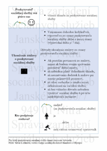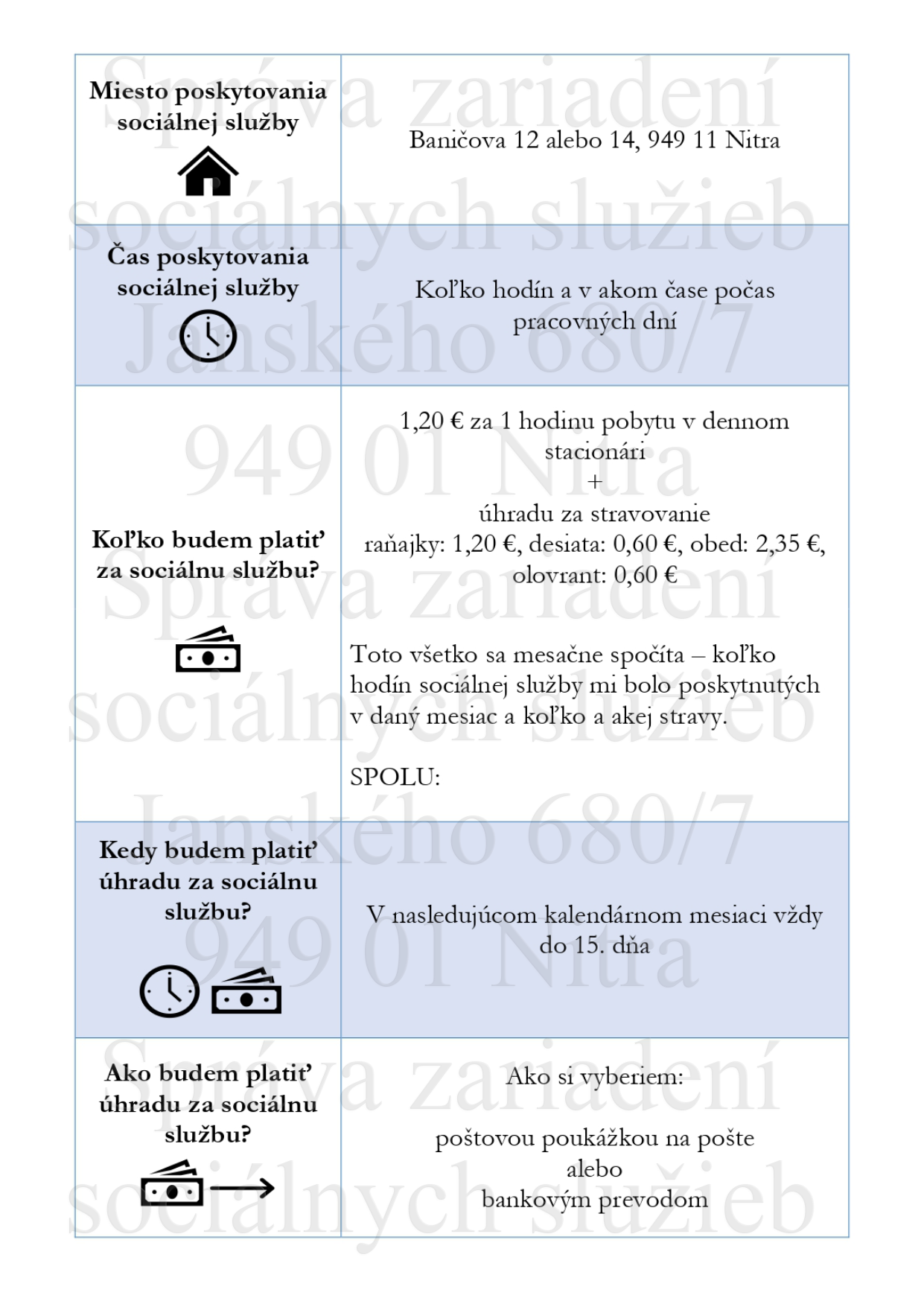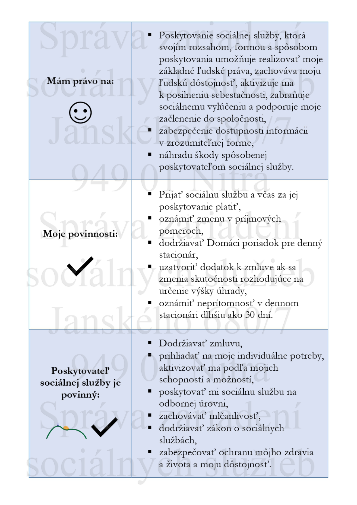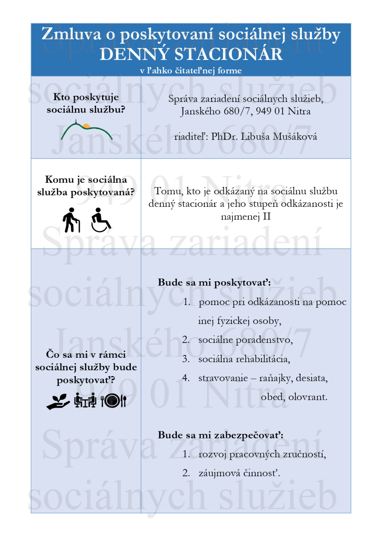 Záujemca o poskytovanie sociálnej služby v dennom stacionári je následne zaradený do evidencie žiadateľov o sociálnu službu. Po podpise zmluvy o poskytovaní sociálnej služby sa záujemca o poskytovanie sociálnej služby stáva prijímateľom sociálnej služby. Zmluva v ľahko čitateľnej forme: |